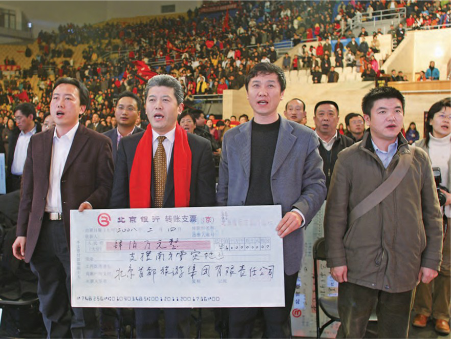 2008年2月,党委副书记、总经理 刘毅代表B体育(中国)一站式服务平台员工和企业,为抗 击冰雪灾害捐款400万元